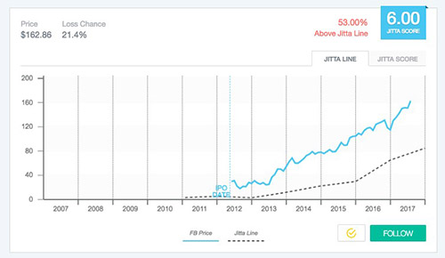 มาดูหุ้นอีกตัวที่น่าสนใจนั่นคือ Facebook หุ้นมหาชนที่ใคร ๆ ก็รู้จัก เป็นหุ้นที่ราคามีการเติบโตตั้งแต่เข้า IPO จนถึงปัจจุบันมากถึง 500% และยังคงเติบโตทำกำไรได้อย่างต่อเนื่อง จากผู้ใช้งานทั่วโลกที่มากกว่า 2 พันล้านคนต่อเดือน มีการทำรายได้จากโฆษณาที่โตอย่างก้าวกระโดด รุกคืบเก็บส่วนแบ่งทางตลาดจากผู้เล่นรายอื่น ๆ และมีนวัตกรรมออกมาทำให้เราทึ่งได้อย่างสม่ำเสมอ ถึงแม้หุ้น Facebook จะเป็นหุ้นที่ดี มี Jitta Score ที่สูง แต่ราคาก็ยังถือว่าแพงกว่าราคาที่เหมาะสมไปมาก เป็นเพราะการให้มูลค่าอนาคตจากนักลงทุนที่สูงนั่นเอง
