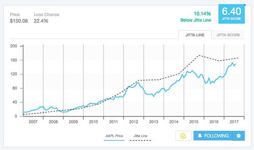 Jitta.com แล้ว หุ้น Apple เป็นหุ้นที่อยู่ในระดับดีทีเดียวโดยมี Jitta Score 6.40 (เต็ม 10) เพราะการบริหารงบการเงิน และการจัดสรรเงินทุนทำได้ดี หุ้น Apple เป็นหุ้นที่แข็งแกร่งมาก จะเห็นได้จากปีวิกฤติ subprime 2008 ก็ไม่ได้รับผลกระทบ แต่กลับโตอย่างมากหลังจากนั้น อาจจะมีตกไปบ้างช่วงปี 2011 จากการเสียชีวิตของศาสดา สตีฟ จ็อบส์ และผลประกอบการที่ไม่เป็นไปตามเป้าทำให้หุ้นล่วงลงมาในปี 2013 และ 2016 แต่หุ้นก็กลับมาเติบโตดังเดิมได้ และเป็นราคาที่ยังต่ำกว่ามูลค่าที่เหมาะสมหรือ Jitta Line อยู่ อย่างที่ปู่บอกค่ะว่า Apple เป็นสินค้าอุปโภคบริโภคไปแล้ว ยิ่งเป็นสินค้าที่มีความจำเป็นในยุคดิจิทัลแล้วด้วย อย่างไรหุ้นก็จะเติบโตไปเรื่อย ๆ ได้อีกแน่นอน