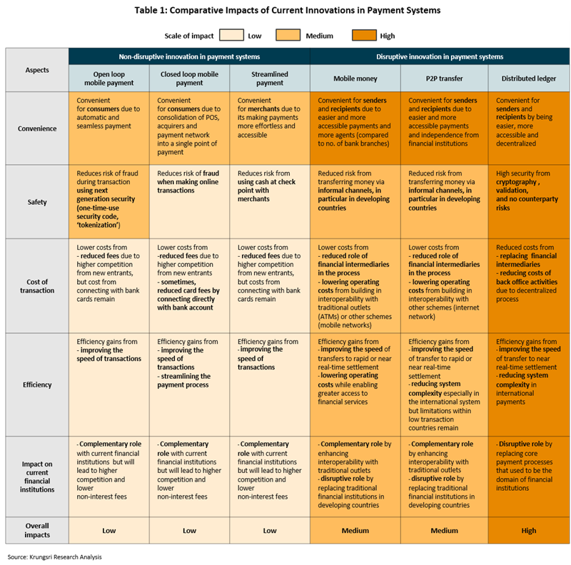 โดยสรุปแล้วนวัตกรรมที่เกิดขึ้นในระบบชำระเงินนั้นส่งผลต่อการเปลี่ยนแปลงในภาคการเงินในหลายด้านโดยนวัตกรรมในกลุ่มNon-disruptiveมีผลในด้านการเพิ่มเพิ่มความสะดวก(Convenience) และทำให้เกิดความปลอดภัย (Safety) ในการชำระเงินมากขึ้น ในขณะที่นวัตกรรมในกลุ่ม Disruptive จะช่วยลดต้นทุนในการชำระเงินลง (Lower cost) ทำให้เกิดประสิทธิภาพ (Efficiency) และที่สำคัญคือการเพิ่มบทบาทของผู้เล่นใหม่ที่ช่วยสนับสนุนการดำเนินงานของสถาบันการเงินเดิม (Complementary) รวมทั้งอาจนำไปสู่การทดแทนบทบาทของสถาบันการเงินในอนาคต โดย Distributed ledger มีศักยภาพในการส่งผลกระทบมากที่สุดเมื่อเทียบกับนวัตกรรมอื่นๆ (ตารางที่ 1)