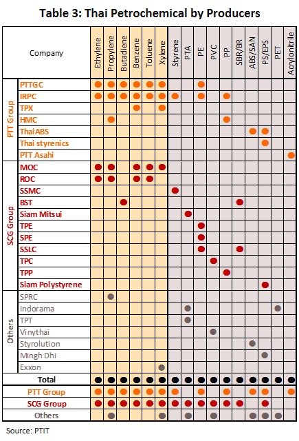 ผู้ผลิตปิโตรเคมีรายใหญ่ของไทยมี 2 กลุ่ม ได้แก่ กลุ่มปตท. (PTT group ส่วนแบ่งตลาด 54%) และกลุ่มซีเมนต์ไทย (SCG group 29%) ทั้ง2 กลุ่มมีการลงทุนในธุรกิจที่เกี่ยวเนื่องทั้งในและต่างประเทศเพื่อสร้างความได้เปรียบในการผลิตและการตลาด โดยกลุ่มปตท.มีธุรกิจเชื่อมโยงกับอุตสาหกรรมต้นน้ำ เช่น ธุรกิจขุดเจาะและผลิตก๊าซธรรมชาติ โรงกลั่นน้ำมัน และมีการผลิตผลิตภัณฑ์ปิโตรเคมีหลากหลายประเภท ขณะที่กลุ่มซีเมนต์ไทยมีธุรกิจต่อเนื่องกับอุตสาหกรรมที่ใช้ผลิตภัณฑ์ปิโตรเคมีเป็นวัตถุดิบ อาทิ สินค้าอุปโภคบริโภคและวัสดุก่อสร้าง สำหรับผู้ผลิตปิโตรเคมีรายอื่นๆ จะเน้นผลิตผลิตภัณฑ์ปิโตรเคมีขั้นกลางและขั้นปลาย ซึ่งมีทั้งที่เป็นบริษัทข้ามชาติหรือร่วมลงทุนกับต่างชาติ เช่น อินโดรามา (Indorama) Exxon และ Ming Dih รวมถึงผู้ผลิตสัญชาติไทย เช่น วีนิไทย
