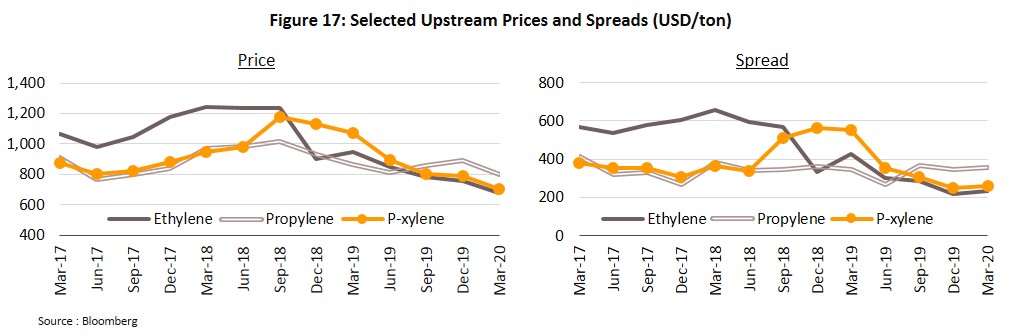 - Polyethylene Terephthalate (PET): Spread ลดลง 43.5% อยู่ที่ 136.3 ดอลลาร์สหรัฐฯต่อตัน เนื่องจากมีกำลังการผลิตใหม่เข้ามาในตลาดเป็นจำนวนมาก  ขณะที่ความต้องการได้รับผลกระทบเช่นเดียวกับ Polypropylene