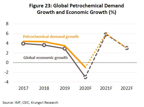 มีแนวโน้มทรงตัวถึงหดตัว 2% สำหรับปี 2564-2565 วิจัยกรุงศรีคาดว่าการฟื้นตัวของเศรษฐกิจโลก (IMF คาดเศรษฐกิจโลกเติบโต 5.8% ในปี 2564  และ 3.0% ปี 2565) จะหนุนให้ความต้องการผลิตภัณฑ์ปิโตรเคมีขยายตัวเฉลี่ย 3.5-4.5% ต่อปี (ภาพที่ 23)