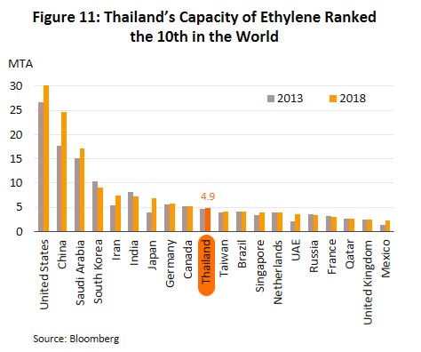Information Handling Services (IHS) ประเมินอุตสาหกรรมปิโตรเคมีโลกมีมูลค่าตลาดราว 7.0 แสนล้านดอลลาร์สหรัฐฯ ในปี 2560 และคาดว่าจะสูงกว่า 1 ล้านล้านดอลลาร์สหรัฐฯ ในปี 2565 โดยจีนเป็นทั้งผู้ผลิตและผู้บริโภคสินค้าปิโตรเคมีรายใหญ่ที่สุดของโลก คิดเป็นสัดส่วนการผลิตราว 29% ของการผลิตปิโตรเคมีโลก และมีส่วนแบ่งการบริโภค 28% ขณะที่สหรัฐฯเป็นประเทศที่มีกำลังการผลิตเอทิลีนสูงสุดในโลก (18.6%) (ภาพที่ 11)