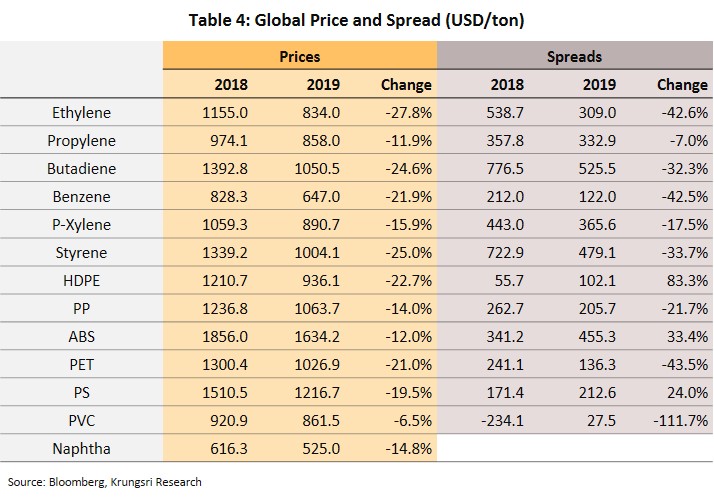 - Ethylene: Spread ลดลง 42.6% จากปี 2561 อยู่ที่ 309 ดอลลาร์สหรัฐฯต่อตัน เนื่องจากมีการปรับลดกำลังการผลิตของผลิตภัณฑ์ปลายทางที่ใช้ Ethylene เป็นวัตถุดิบโดยเฉพาะในตะวันออกกลาง ทำให้มีอุปทานส่วนเกินเพิ่มขึ้น นอกจากนี้ ยังมีอุปทานใหม่จากการขยายกำลังการผลิตของผู้ผลิตในเอเชียกดดันราคาลดลงต่อเนื่อง