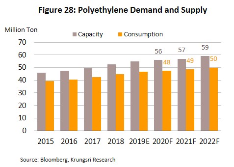 คาดว่าความต้องการใช้ผลิตภัณฑ์โพลีเอทิลีนจะเพิ่มขึ้นเฉลี่ย 2.3% ต่อปี ขณะที่กำลังการผลิตจะเติบโตเฉลี่ย 2.6% ต่อปี ส่งผลให้ตลาดโพลีเอทิลีนเผชิญภาวะอุปทานล้นตลาดต่อเนื่อง กดดันให้ราคาทรงตัวในระดับต่ำ ขณะที่ Spread (โพลีเอทิลีน-เอทิลีน) มีแนวโน้มทรงตัวหรือเพิ่มขึ้นเล็กน้อย