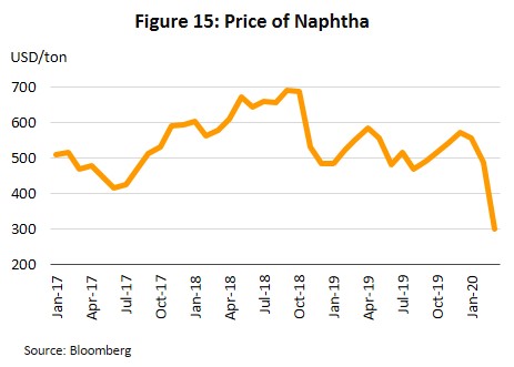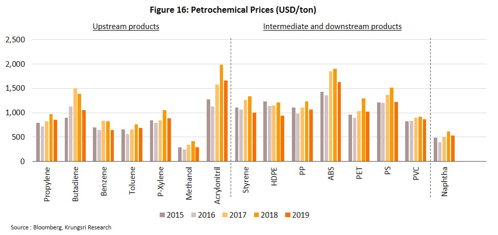 ราคาแนฟทามีแนวโน้มปรับลดลงตามราคาน้ำมันดิบ แม้แรงกดดันด้านอุปทานจะลดลง เนื่องจากความต้องการน้ำมันแก๊สโซลีนมีแนวโน้มขยายตัวดี ทำให้โรงกลั่นน้ำมันหันไปผลิตน้ำมันแก๊สโซลีนแทนแนฟทา วิจัยกรุงศรีคาดว่าราคาแนฟทาจะเฉลี่ยที่ 365.8 ดอลลาร์สหรัฐฯต่อตันในปี 2563 ก่อนเพิ่มขึ้นเป็น 440.6 และ 482.1 ดอลลาร์ในปี 2564 และ 2565 ตามลำดับ เทียบกับ 525 ดอลลาร์ในปี 2562  ซึ่งจะส่งผลต่อเนื่องสู่ผลิตภัณฑ์กลางน้ำและปลายน้ำของธุรกิจปิโตรเคมีในด้านต้นทุน ราคาขาย และส่วนต่างราคาผลิตภัณฑ์