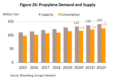 คาดว่ากำลังการผลิตจะเพิ่มขึ้นเฉลี่ย 2.9% ต่อปี โดยเฉพาะจากจีนซึ่งมีนโยบายลดการนำเข้าสารเคมีจากต่างประเทศ ขณะที่ความต้องการใช้จะเพิ่มขึ้นเฉลี่ย 3.1% ต่อปี ทั้งนี้ ราคาโพรพิลีนจะถูกกดดันจากอุปทานส่วนเกินในตลาด และราคาเอทิลีน (ผลิตภัณฑ์ปิโตรเคมีที่ใช้แทนกันได้) ทำให้ Spread มีแนวโน้มทรงตัว
