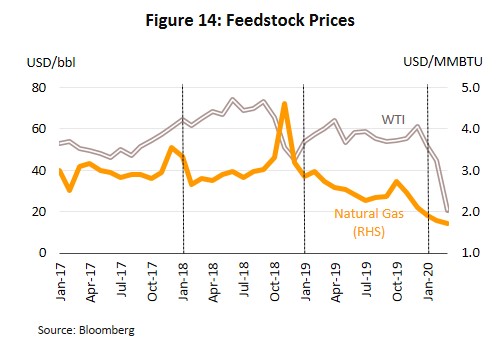 ราคาน้ำมันดิบในตลาดโลกปี 2562  (หนึ่งในวัตถุดิบตั้งต้นของอุตสาหกรรมปิโตรเคมี) ปรับลดลง ผลจากอุปทานน้ำมันเพิ่มขึ้นโดย เฉพาะจากกลุ่ม Non-OPEC ท่ามกลางอุปสงค์น้ำมันที่ชะลอลง โดยราคาน้ำมันดิบ WTI เฉลี่ยทั้งปีอยู่ที่ 57.0 ดอลลาร์สหรัฐฯต่อบาร์เรล ลดลง 12.2% จากปี 2561 ส่งผลให้ราคาแนฟทาซึ่งมีน้ำมันดิบเป็นวัตถุดิบตั้งต้นลดลง 14.8% มาเฉลี่ยที่ 525 ดอลลาร์สหรัฐฯต่อตัน ขณะที่ราคาก๊าซธรรมชาติลดลง 19.4% เฉลี่ยที่ 2.5 ดอลลาร์สหรัฐฯต่อ 1 ล้าน BTU (MMBTU) (ภาพที่ 14 และ 15) ทั้งนี้ อัตราการลดลงของราคาก๊าซธรรมชาติที่มากกว่าการลดลงของราคาแนฟทา ส่งผลให้ผู้ประกอบการที่ใช้ก๊าซธรรมชาติเป็นวัตถุดิบหลัก