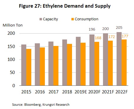 กำลังการผลิตเอทิลีนมีแนวโน้มขยายตัวเฉลี่ย 3.2% ต่อปีในช่วง 3 ปีข้างหน้า ส่วนใหญ่มาจากกำลังการผลิตที่เพิ่มขึ้นในเอเชีย โดยเฉพาะจีนที่มีนโยบายลดการพึ่งพาการนำเข้าสารเคมี(Base chemical self-sufficiency) โดยจีนมีแผนก่อสร้างโรงงานเอทิลีนใหม่ 38 แห่งภายในปี 2573 นอกจากนี้ สหรัฐฯ มีแนวโน้มส่งออกผลิตภัณฑ์โพลีเอทิลีนมาเอเชียมากขึ้น ส่งผลให้อุปทานเอทิลีนอาจล้นตลาด เนื่องจากคาดว่าความต้องการใช้เอทิลีนจะเพิ่มขึ้นเฉลี่ย 2.5% ต่อปี ส่งผลให้ราคาเอทิลีนและ Spread (เอทิลีน-แนฟทา) มีแนวโน้มทรงตัว