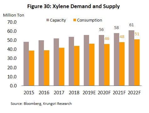 คาดว่าความต้องการใช้ไซลีนจะเพิ่มขึ้นเฉลี่ย 3.3% ต่อปี ขณะที่กำลังการผลิตเพิ่มขึ้นเฉลี่ย 3.0% ต่อปี โดยกำลังการผลิตใหม่จะเพิ่มขึ้นทั้งในจีน ตะวันออกกลาง และไทย (บริษัท IRPC เลื่อนการขยายกำลังการผลิตจากปี 2563) ทำให้ Spread (PX-แนฟทา) ทรงตัวถึงเพิ่มขึ้น