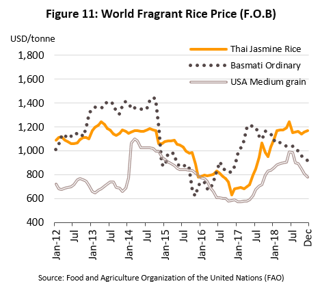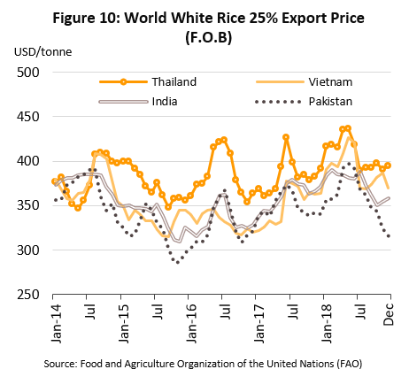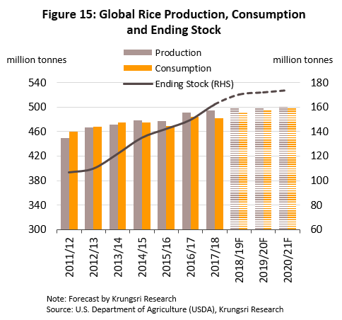 ด้านราคาส่งออกข้าวของไทยคาดว่ายังทรงตัวได้ในระดับสูงใกล้เคียงกับปี 2561 ปัจจัยหนุนจาก 1) ความต้องการบริโภคข้าวในตลาดโลกที่คาดว่าจะยังคงเพิ่มขึ้นต่อเนื่อง 2) ข้าวส่งออกของไทยเป็นข้าวคุณภาพสูง (ข้าวที่ระบายจากสต็อกรัฐในช่วงหลายปีก่อนส่วนใหญ่เป็นข้าวที่ไม่เหมาะสำหรับการบริโภค) จะช่วยให้ราคาข้าวส่งออกยังอยู่ในระดับดี แม้สต๊อกข้าวโลกจะยังคงมีแนวโน้มเพิ่มขึ้นต่อเนื่อง (ภาพที่ 15) ทั้งจากไทย อินเดีย และเวียดนาม และ 3) ผลกระทบจากภัยแล้งที่ทำให้ราคาข้าวยังคงปรับตัวสูงขึ้น