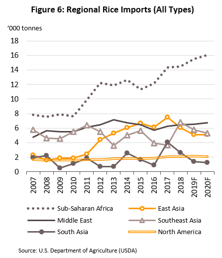 นอกจากนี้ ไทยยังมีการส่งออกปลายข้าว10/ ประมาณ 1.1-1.5 ล้านตัน/ปี เพื่อนำไปใช้ในอุตสาหกรรมการผลิตแป้งและอาหารสัตว์ โดยมีตลาดส่งออกหลัก คือ จีน และประเทศในทวีปแอฟริกา อีกทั้งยังมีการส่งออกข้าวเหนียวและข้าวกล้อง ซึ่งมีปริมาณการส่งออกไม่มากนัก (รวมกันประมาณ 0.3-0.4 ล้านตัน/ปี) เนื่องจากเป็นข้าวที่บริโภคในประเทศเป็นหลัก