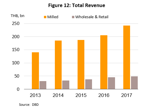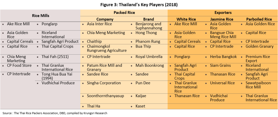 ผู้ผลิตข้าวถุง: รายได้ของธุรกิจอยู่ในระดับประคองตัว เนื่องจากส่วนใหญ่เป็นผู้ประกอบการรายใหญ่ที่ทำธุรกิจแบบครบวงจรมีทั้งโรงสีและบริษัทส่งออกข้าว อีกทั้งความต้องการบริโภคข้าวภายในประเทศยังเติบโตต่อเนื่องประกอบกับพฤติกรรมการบริโภคข้าวถุงที่เพิ่มขึ้นตามการขยายตัวของชุมชนเมือง อย่างไรก็ตาม การแข่งขันด้านราคาของตลาดข้าวถุงภายในประเทศเพิ่มสูงขึ้น เนื่องจากมีผู้เล่นหน้าใหม่ทยอยเข้าสู่ตลาด ขณะที่ต้นทุนการนำสินค้าเข้าตลาดมีแนวโน้มสูงขึ้น อาทิ ค่าการตลาด ค่าวางสินค้า