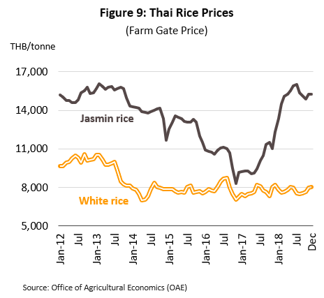 ผู้ส่งออกข้าว: คาดว่าปริมาณส่งออกข้าวของไทยจะลดลงเมื่อเทียบกับฐานสูงในช่วงปี 2560-2561 ที่ได้อานิสงส์จากการเร่งระบายสต็อกข้าวของรัฐ อย่างไรก็ตามรายได้จากการส่งออกข้าวยังมีแนวโน้มเพิ่มขึ้น จากผลของราคาส่งออกที่คาดว่าจะสูงขึ้นโดยเฉพาะข้าวหอมมะลิ ส่วนผู้ส่งออกข้าวขาวยังมีมาร์จินจากความต้องการของประเทศคู่ค้าที่ยังเพิ่มขึ้น