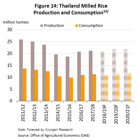 ความต้องการบริโภคภายในประเทศคาดว่ายังอยู่ในระดับสูงราว 11.0-11.5 ล้านตันข้าวสารต่อปีในปี 2562-2564 เพิ่มขึ้นจากระดับ 10.8 ล้านตันในปี 2561/2562 โดยมีปัจจัยหนุนจากความต้องการบริโภคในครัวเรือน (สัดส่วน 33% ของความต้องการบริโภคข้าวทั้งหมด[18]) ที่ยังคงขยายตัวและความต้องการใช้ข้าวในภาคอุตสาหกรรมการผลิตอาหารและขนมขบเคี้ยว (นำข้าวไปแปรรูปมีสัดส่วนประมาณ 10-13%) ที่มีแนวโน้มใช้ข้าวเป็นส่วนประกอบของการแปรรูปมากขึ้น