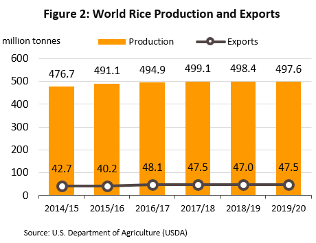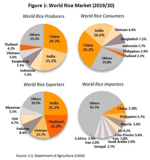 ไทยเป็นประเทศผู้ผลิตและส่งออกข้าวสำคัญของโลกมายาวนาน ในปี 2562/2563 ไทยมีผลผลิตข้าวมากเป็นอันดับ 6 ของโลก โดยปริมาณผลผลิตข้าวสารของไทยคิดเป็น 4.2% ของผลผลิตข้าวทั่วโลก (รองจากจีน อินเดีย อินโดนีเซีย บังคลาเทศ และเวียดนาม ซึ่งมีสัดส่วนปริมาณผลผลิต 29.3%, 23.1%, 7.5%, 7.1% และ 5.6% ตามลำดับ) และไทยเป็นผู้ส่งออกข้าวอันดับ 2 ของโลก มีส่วนแบ่งตลาดคิดเป็น 21.0% รองจากอินเดียซึ่งมีส่วนแบ่งตลาด 25.2% และยังมีคู่แข่งอื่นๆ อาทิ เวียดนาม ปากีสถาน สหรัฐฯ เมียนมา เป็นต้น (ภาพที่ 1) อย่างไรก็ตาม ปริมาณการค้าข้าวในตลาดโลกมีสัดส่วนเพียงประมาณ 9.6% ของผลผลิตข้าวทั่วโลก (ภาพที่ 2) เนื่องจากข้าวเป็นพืชที่ปลูกเพื่อความมั่นคงด้านอาหารของประเทศ (ใช้บริโภค) เป็นหลัก ดังนั้นปริมาณการค้าข้าวระหว่างประเทศ (การส่งออก-นำเข้า) จึงเป็นเพียงผลผลิตส่วนเกินและ/หรือส่วนขาดจากการบริโภคในแต่ละประเทศ ภาวะตลาดส่งออกจึงมักผันผวนตามปริมาณผลผลิตและการบริโภคในประเทศผู้ส่งออกและนำเข้า