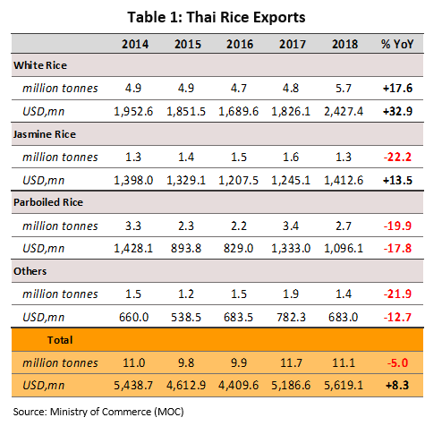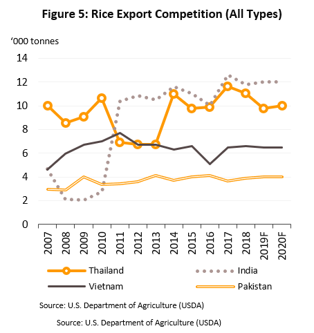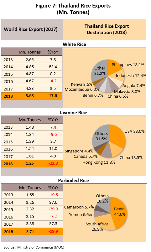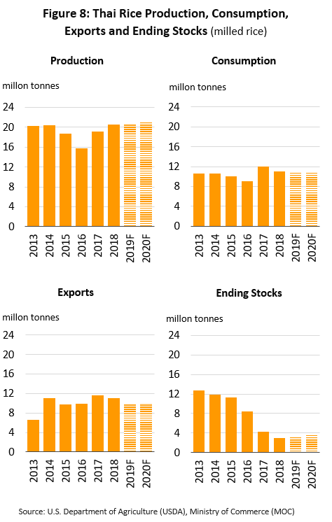 การส่งออกข้าวของไทยมีแนวโน้มอยู่ที่ประมาณ 9-10 ล้านตัน/ปี ในปี 2562-2564 ลดลงจากระดับ 11.1 ล้านตันในปี 2561 ผลจากการระบายสต๊อกข้าวภาครัฐจากโครงการรับจำนำข้าวที่หมดลงหลังจากการเร่งระบายข้าวในช่วงปี 2560-2561 และผลจากการที่ผู้ซื้อบางส่วนหันไปนำเข้าข้าวราคาถูกจากประเทศคู่แข่งมากขึ้น โดยเฉพาะจีนที่คาดว่าจะเป็นผู้ส่งออกอันดับต้นๆ เนื่องจากมีสต๊อกข้าวคงค้างเกินกว่าความต้องการในประเทศอยู่ถึง 117 ล้านตัน ซึ่งจะระบายเข้าสู่ตลาดโลกได้ถึงปี 2563 อย่างไรก็ตาม ปริมาณการส่งออกตามระดับที่คาดการณ์ข้างต้นถือว่าเป็นการปรับฐานมาอยู่ในระดับปกติใกล้เคียงกับช่วงก่อนโครงการรับจำนำข้าว