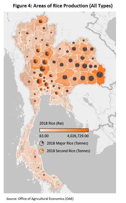 รอบปีเพาะปลูก 2561/62 ไทยมีพื้นที่ปลูกข้าวทั้งสิ้น 71.9 ล้านไร่ ส่วนใหญ่อยู่ในภาคเหนือตอนล่าง ภาคกลาง และภาคตะวันออกเฉียงเหนือ โดยการปลูกข้าวของไทยเน้นพึ่งน้ำฝน มีช่วงเวลาเพาะปลูกสำคัญในฤดูฝนช่วงเดือน ก.ค.-ก.ย.ของทุกปี และเก็บเกี่ยวในช่วงปลายปี เรียกว่า “ข้าวนาปี” มีผลผลิตทั้งข้าวขาว ข้าวหอมมะลิ และข้าวเหนียว ซึ่งมีปริมาณรวมกันกว่า 83% ของผลผลิตข้าวรวมทั้งประเทศในแต่ละรอบปีการเพาะปลูก ส่วนที่เหลือประมาณ 17% เป็นข้าวที่ปลูกในฤดูแล้งซึ่งต้องอาศัยน้ำจากระบบชลประทาน เรียกว่า “ข้าวนาปรัง” มักเพาะปลูกในภาคเหนือและกลาง[2][3]
