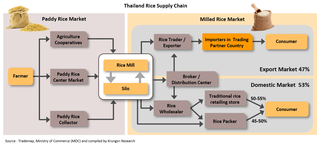 สำหรับการส่งออกข้าวของไทยมีปริมาณใกล้เคียงกับการบริโภคในประเทศ โดยข้าวไทยยังคงได้รับการยอมรับด้านคุณภาพและเป็นที่ต้องการของตลาดโลก มีตลาดส่งออกสำคัญ คือ เบนิน จีน สหรัฐฯ ทวีปแอฟริกา อาเซียน และตะวันออกกลาง ทั้งนี้ ประเภทข้าวที่ไทยส่งออกเป็นปริมาณมาก คือ ข้าวขาว ข้าวหอมมะลิ และ ข้าวนึ่ง ซึ่งมีโครงสร้างตลาดส่งออก ดังต่อไปนี้