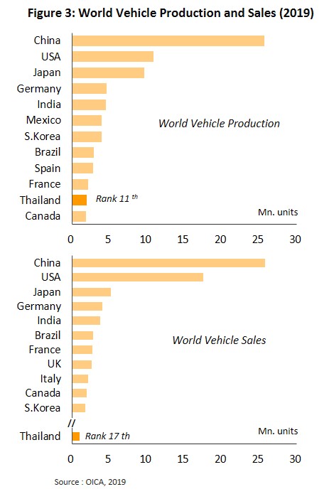 ด้านสถานะของอุตสาหกรรมรถยนต์ไทยในตลาดโลก (ข้อมูลปี 2562) พบว่าไทยมีปริมาณการผลิตรถยนต์ทุกประเภทเป็นอันดับที่ 11 ของโลก อันดับ 5 ของเอเชีย และอันดับ 1 ของอาเซียน และหากพิจารณาจากยอดจำหน่ายรถยนต์เชิงปริมาณ พบว่าตลาดรถยนต์ของไทยใหญ่เป็นอันดับที่ 17 ของโลก อันดับ 6 ของเอเชีย และอันดับ 2 ของอาเซียน (ภาพที่ 3) แบ่งเป็น