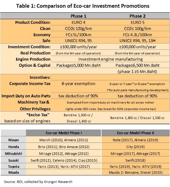 - มาตรการส่งเสริมการผลิตรถยนต์นั่งขนาดเล็กประหยัดพลังงานหรืออีโคคาร์ (Eco-car) เป็น Product Champion ลำดับที่สองของประเทศ (ปี 2552-2558) โดยภาครัฐออกมาตรการด้านภาษีดึงดูดการลงทุน (พร้อมกำหนดเงื่อนไขการผลิตเพื่อส่งออก) 2 รอบ คือ “Eco-car Phase I” (ปี 2552) และ “Eco-car Phase II” (ปี 2558) (ตารางที่ 1) ท่ามกลางปัจจัยหนุนตลาดรถ Eco-car หลายด้าน อาทิ (1) ความก้าวหน้าของเทคโนโลยีการผลิตเครื่องยนต์เบนซิน ทำให้สามารถใช้น้ำมันผสมเอทานอล (หรือน้ำมันแก๊สโซฮอล์) เป็นเชื้อเพลิง (2) ภาครัฐมีนโยบายสนับสนุนการใช้เชื้อเพลิงชีวภาพสำหรับรถยนต์ทุกประเภทซึ่งรวมถึง Eco-car โดยมีการนำเงินจากกองทุนน้ำมันมาอุดหนุน ทำให้ราคาน้ำมันแก๊สโซฮอล์อยู่ในระดับต่ำ (3) การกำหนดให้รถ Eco-car สามารถใช้สิทธิ์คืนภาษีสรรพสามิตได้ตามเงื่อนไขโครงการรถยนต์คันแรก[1] (ปี 2555-2556) และ (4) การปรับโครงสร้างภาษีสรรพสามิตรถยนต์ โดยจัดเก็บภาษีตามอัตราการปล่อยก๊าซคาร์บอนไดออกไซด์ (CO2) ควบคู่กับขนาดเครื่องยนต์ (ปี 2559) ส่งผลให้รถยนต์ที่มีเครื่องยนต์ขนาดใหญ่มีราคาสูงขึ้นมากตามอัตราภาษีที่เพิ่มขึ้น ขณะที่รถ Eco-car (มีมาตรฐานการปล่อยก๊าซ CO2 ต่ำตามเงื่อนไขขอรับการส่งเสริมการลงทุนจากฺคณะกรรมการส่งเสริมการลงทุน: BOI) มีราคาถูกลงจากอัตราภาษีที่ปรับลดเหลือ 12-15% (จากเดิมที่ 17%)