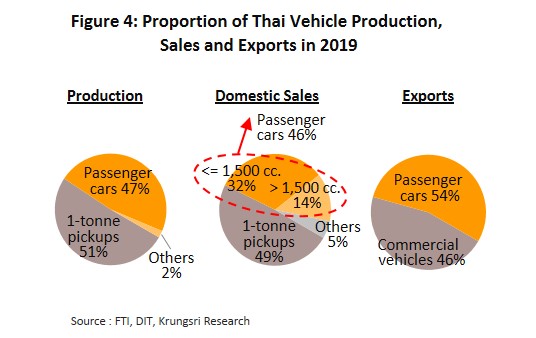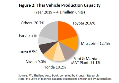สำหรับตลาดรถยนต์ในประเทศ ปี 2562 มีกำลังการผลิตรถยนต์ทุกประเภทอยู่ที่ประมาณ 4.1 ล้านคัน[2] เป็นการผลิตรถยนต์นั่งและรถยนต์เพื่อการพาณิชย์ในสัดส่วนใกล้เคียงกัน (การผลิตรถยนต์เพื่อการพาณิชย์กว่า 90% เป็นการผลิตรถปิกอัพขนาด 1 ตัน) โดยค่ายรถยนต์ญี่ปุ่นมีส่วนแบ่งการผลิตประมาณ 80% ของกำลังการผลิตรถยนต์ทุกประเภท (ภาพที่ 2)