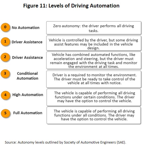 สำหรับแนวโน้มในระยะยาว อุตสาหกรรมรถยนต์จะให้ความสำคัญกับการพัฒนาเทคโนโลยียานยนต์ไฟฟ้า ซึ่งภาครัฐกำหนดเป้าหมายให้ไทยเป็นฐานการผลิตรถยนต์ไฟฟ้าของภูมิภาค วิจัยกรุงศรีคาดว่าปริมาณการใช้รถยนต์ไฟฟ้าในไทยจะเติบโตอย่างรวดเร็วภายในระยะเวลา 4-6 ปี ผลจาก (1) การพัฒนาแบตเตอรี่ลิเทียมไอออนทำให้ราคาลดลงต่อเนื่อง[2] (ปี 2562 ราคาแบตเตอรี่ลิเทียมไอออนอยู่ที่ 156 USD/kWh ลดลงจาก 1,200 USD/kWh ในปี 2553) และภายในปี 2565 ราคารถยนต์ไฟฟ้าแบบแบตเตอรี่ (BEV) จะใกล้เคียงรถยนต์เครื่องยนต์สันดาปภายใน (ICE) [13] (2) ผู้ประกอบการบางรายมีแผนขยายการลงทุนผลิตรถยนต์ไฟฟ้าและแบตเตอรี่สำหรับรถยนต์ไฟฟ้า ส่งผลให้อุปทานในตลาดเพิ่มขึ้น (ภาพที่ 10) และ (3) รัฐบาลตั้งเป้าเพิ่มสัดส่วนปริมาณการผลิตยานยนต์ไฟฟ้า (รถยนต์ไฟฟ้าและรถจักรยานยนต์ไฟฟ้า) เป็น 30% ของปริมาณการผลิตยานยนต์ทั้งหมดในประเทศ ภายในปี 2573 นอกจากนี้ การพัฒนาเทคโนโลยีสื่อสารโทรคมนาคม 5G ที่มาเร็วกว่าคาด (ล่าสุด16 กุมภาพันธ์ 2563 ภาครัฐจัดประมูลคลื่นความถี่ 5G และคาดว่าจะเริ่มใช้เชิงพาณิชย์ประมาณไตรมาส 3/2563)[14] จะเป็นปัจจัยหนุนรองรับรถยนต์ระบบขับเคลื่อนอัตโนมัติที่อาจมีบทบาทเพิ่มขึ้นในระยะต่อไป ปัจจุบันการพัฒนาเทคโนโลยีขับเคลื่อนอัตโนมัติ (Auto Pilot) ในรถยนต์ของไทยอยู่ในช่วงต้นระดับ 0-2 (ภาพที่ 11) ส่วนรถ Tesla และ Audi A8 อยู่ระดับ 3 สำหรับระดับ 4 ซึ่งเป็นระดับสูงสุดอยู่ในช่วงทดลองโดยบริษัท Waymo ของ Google และ Self-driving cars ของ Uber สำหรับประเด็นที่รัฐบาลควรใช้การสนับสนุน คือ การพัฒนาสาธารณูปโภคพื้นฐานสำหรับรถยนต์ไฟฟ้า เช่น สถานีชาร์จไฟฟ้าซึ่งยังไม่ครอบคลุมทั่วประเทศ และการพัฒนาระบบโครงข่ายไฟฟ้าที่ใช้เทคโนโลยีสารสนเทศเชื่อมต่อผ่านมิเตอร์อัจฉริยะ[15] เพื่อให้การใช้รถยนต์ไฟฟ้าสามารถรองรับระบบ Vehicle-to-Home (V2H) ได้อย่างมีประสิทธิภาพ