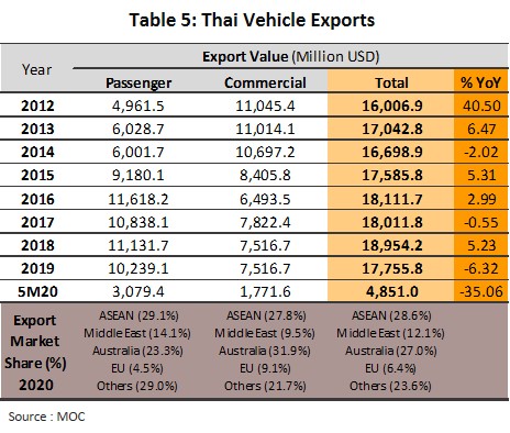 - รถยนต์เพื่อการพาณิชย์: มูลค่าส่งออก 7.5 พันล้านดอลลาร์ หดตัว 3.9% ผลจากยอดส่งออกรถปิกอัพขนาด 1 ตัน (สัดส่วน 98.4% ของมูลค่าส่งออกรถเพื่อการพาณิชย์) หดตัว 2.8% คิดเป็นมูลค่า 7.4 พันล้านดอลลาร์ ตลาดออสเตรเลียหดตัว 19.3% (สัดส่วน 32% ของมูลค่าส่งออกรถปิกอัพทั้งหมด) จากภาวะเศรษฐกิจชะลอตัว ตลาดอสังหาริมทรัพย์หดตัวต่อเนื่อง และออสเตรเลียประสบกับภาวะแห้งแล้ง ด้านตลาดอาเซียนเติบโต 14.4% (สัดส่วน 19%) ตามทิศทางเศรษฐกิจที่ขยายตัวต่อเนื่อง และอานิสงส์จากการค้าเสรีในกลุ่มอาเซียน ส่วนยอดส่งออกรถเพื่อการพาณิชย์อื่นๆ (รถบรรทุก รถโดยสาร และรถตู้) มีมูลค่า 119.0 ล้านดอลลาร์สหรัฐฯ หดตัว 43.8%