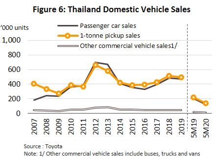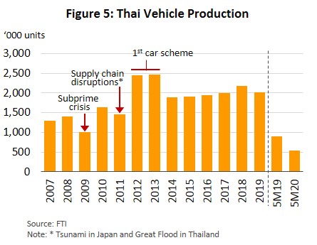 สำหรับอุตสาหกรรมรถยนต์ช่วงเดือนมกราคม-พฤษภาคม 2563 พบว่าการผลิตรถยนต์หดตัว 40.2% YoY อยู่ที่ 5.3 แสนคัน โดยเป็นการหดตัวทั้งตลาดในประเทศและตลาดส่งออก ผลจากการแพร่ระบาดของไวรัส COVID-19 ฉุดเศรษฐกิจโลกและไทยเข้าสู่ภาวะถดถอย และเกิดการหยุดชะงักของห่วงโซ่การผลิต ประกอบกับปัญหาภัยแล้งในประเทศกดดันอำนาจซื้อของเกษตรกร โดยมีรายละเอียด ดังนี้
