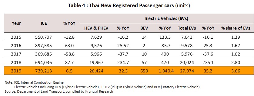 - ยอดจำหน่ายรถยนต์นั่งไฟฟ้า (EV)[4] (พิจารณาจากยอดจดทะเบียนใหม่) ขยายตัว 35.2% อยู่ที่ 27,074 คัน คิดเป็นสัดส่วน 3.7% ของรถยนต์นั่งจดทะเบียนใหม่ทั้งหมด เพิ่มขึ้นจาก 1.4% ในปี 2558 (ตารางที่ 4) โดยรถยนต์ไฟฟ้าแบตเตอรี่เพิ่มขึ้นกว่า 10 เท่า ผลจากค่ายรถยนต์ MG และ FOMM ซึ่งได้รับส่งเสริมการลงทุนผลิตรถ EV จาก BOI เปิดตัวรถรุ่น MG eZS และ FOMM ONE ตามลำดับ ผนวกกับผู้ประกอบการบางรายนำเข้ารถยนต์ไฟฟ้าแบตเตอรี่มาจำหน่าย อาทิ Nissan Leaf Hyundai IONIQ electric Hyundai Kona Electric Audi e-tron 55 quattro และ Jaguar I-Pace สำหรับรถยนต์ไฟฟ้าไฮบริดและปลั๊กอินไฮบริดขยายตัว 32.3% โดยค่ายรถยนต์ Toyota Mercedes-Benz และ BMW ทยอยผลิตรถหลายรุ่นสู่ตลาด อาทิ Toyota รุ่น C-HR รุ่น Camry รุ่น Corolla Altis Hybrid Mercedes-Benz รุ่น C 300e และ BMW รุ่น X5 Plug-in Hybrid อย่างไรก็ตาม รถยนต์ EV ยังมีส่วนแบ่งตลาดต่ำ เนื่องจากอยู่ในช่วงแนะนำสินค้าเข้าสู่ตลาด (Introduction Stage) และเป็นตลาดเฉพาะกลุ่ม (Niche Market) สำหรับผู้มีกำลังซื้อสูง