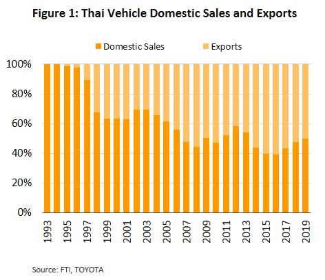 การลงทุนของบริษัทรถยนต์ข้ามชาติในไทยเพิ่มขึ้นมากนับจากเกิดเหตุการณ์ Plaza Accord ปี 2530 ส่วนใหญ่เป็นค่ายรถยนต์สัญชาติญี่ปุ่นที่เผชิญภาวะเงินเยนแข็งค่าลดทอนความสามารถในการแข่งขันของฐานผลิตรถยนต์ในญี่ปุ่น ประกอบกับหลังเกิดวิกฤตเศรษฐกิจปี 2540 รัฐบาลไทยมีนโยบายผ่อนปรนให้ต่างชาติเข้ามาถือหุ้นในกิจการไทย พร้อมทั้งกำหนดแผนพัฒนาอุตสาหกรรมยานยนต์ของประเทศ โดยมีเป้าหมายให้ไทยเป็นศูนย์กลางการผลิตรถยนต์ของภูมิภาคเอเชีย (Detroit of Asia) ส่งผลให้อุตสาหกรรมรถยนต์มีการพัฒนาอย่างต่อเนื่อง สะท้อนจากปริมาณการผลิตรถยนต์เพิ่มขึ้นจาก 0.36 ล้านคันในปี 2540 เป็น 2.01 ล้านคันในปี 2562 หรือขยายตัวเฉลี่ย 8.6% ต่อปี (% CAGR) และนับจากปี 2551 เป็นต้นมา โครงสร้างตลาดรถยนต์เปลี่ยนจากผลิตเพื่อใช้ในประเทศเป็นผลิตเพื่อส่งออก (ไม่รวมช่วงปี 2555-2556 ซึ่งตลาดรถยนต์ในประเทศเติบโตอย่างมากจากผลของโครงการรถคันแรกของรัฐบาล)