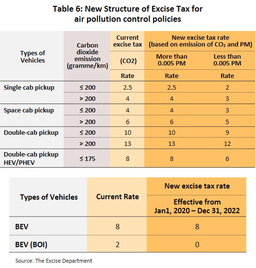 ทั้งนี้ ตลาดรถยนต์เครื่องยนต์สันดาปภายในอาจถูกกดดันจากนโยบายควบคุมมลพิษทางอากาศสำหรับรถยนต์ใหม่ ซึ่งภาครัฐออกมาตรการ ดังนี้ (1) กำหนดให้รถยนต์ใหม่ทุกประเภทต้องผ่านมาตรฐานยูโร 5 และ 6 ภายในปี 2564 และ 2565 ตามลำดับ (ปัจจุบันอยู่ที่มาตรฐานยูโร 4) อาจกระทบต้นทุนการผลิต เนื่องจากต้องพัฒนาเครื่องยนต์ให้มีประสิทธิภาพสูงขึ้น (2) ปรับลดอัตราภาษีสรรพสามิต 1-2% สำหรับรถปิกอัพ และรถปิกอัพ 4 ประตูที่ใช้น้ำมัน B20 หรือรถที่มีการยกระดับมาตรฐานเครื่องยนต์ให้ปล่อยฝุ่นละอองไม่เกิน 0.005 กรัมต่อกิโลเมตร (มีผลปี 2562) และ (3) ยกเว้นภาษีสรรพสามิตรถยนต์ไฟฟ้าแบบแบตเตอรี่ (BEV) สำหรับค่ายรถที่ได้รับส่งเสริมการลงทุนจาก BOI (เดิมเสียภาษีอัตรา 2%) มีผล 1 มกราคม 2563-31 ธันวาคม 2565 (ตารางที่ 6) มาตรการดังกล่าวจะส่งผลให้รถปิกอัพที่ใช้น้ำมัน B20 และรถ BEV ที่เข้าเกณฑ์ข้างต้นมีราคาลดลง เพิ่มแรงจูงใจให้ผู้บริโภคสนใจซื้อรถยนต์ที่เป็นมิตรต่อสิ่งแวดล้อมมากขึ้น