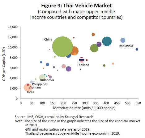 - ยอดจำหน่ายรถยนต์ในประเทศปี 2563 มีแนวโน้มหดตัว 39.0-40.0% อยู่ที่ 0.60-0.61 ล้านคัน ต่ำสุดตั้งแต่ปี 2542 เนื่องจากผู้บริโภคระมัดระวังการใช้จ่ายโดยเฉพาะการซื้อสินค้าคงทนเช่นรถยนต์ จะทำให้เกิดภาระหนี้ผูกพันระยะยาวและจัดเป็นสินค้าฟุ่มเฟือย อย่างไรก็ตาม วิจัยกรุงศรีประเมินว่ายอดจำหน่ายจะฟื้นตัวในปี 2564 และ 2565 โดยเพิ่มขึ้นเฉลี่ย 3.0-4.0% ต่อปี อยู่ที่ 0.62-0.63 ล้านคันและ 0.64-0.65 ล้านคัน ตามลำดับ จากปัจจัยสนับสนุน ได้แก่ (1) ผู้บริโภคบางส่วนที่ซื้อรถยนต์ในช่วงโครงการรถคันแรกมีแนวโน้มเปลี่ยนรถใหม่ (ประมาณ 2-3 แสนคัน ในปี 2563-2565)[7] (2) ปี 2563-2565 ผู้ประกอบการมีแผนเปิดตัวรถยนต์รุ่นใหม่เพื่อกระตุ้นตลาดมากกว่า 20 รุ่น ส่วนใหญ่เป็นรุ่นที่ได้รับความนิยมและรถยนต์ไฟฟ้า[8] อีกทั้งค่ายรถ MG ประกาศนำร่องทำตลาดรถยนต์ขับขี่กึ่งอัตโนมัติ[9] ภายในปี 2564 (3) ภาคก่อสร้างจะฟื้นตัวตามแผนการลงทุนภาครัฐ หนุนความต้องการรถเพื่อการพาณิชย์ เพื่อการบรรทุกและขนส่ง (4) การพัฒนาเส้นทางคมนาคมใหม่ทั้งในประเทศและเชื่อมโยงกับประเทศเพื่อนบ้าน รวมทั้งแนวโน้มการขยายตัวของธุรกิจค้าปลีกออนไลน์และโลจิสติกส์ ทำให้ความต้องการรถเพื่อการพาณิชย์ขนาดกลาง-เล็กเพิ่มขึ้น และ (5) อัตราการถือครองรถยนต์ (Motorization Rate) ของไทยอยู่ที่ 285 คันต่อประชากร 1 พันคน ต่ำกว่าเมื่อเทียบกับประเทศในกลุ่ม Upper-Middle Income เช่น มาเลเซียซึ่งอยู่ที่ 478 คันต่อประชากร 1 พันคน สะท้อนว่าตลาดรถยนต์ของไทยมีโอกาสเติบโตได้ต่อเนื่อง (ภาพที่ 9)