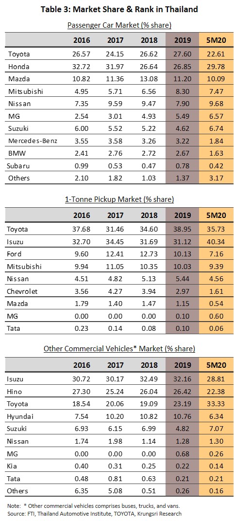[7] ประเมินโดยวิจัยกรุงศรี อ้างอิงจากบทสัมภาษณ์ตีพิมพ์ในหนังสือพิมพ์ของค่ายรถยนต์ และพฤติกรรมการเปลี่ยนรถยนต์เมื่ออายุใช้งานครบ 5-7 ปี