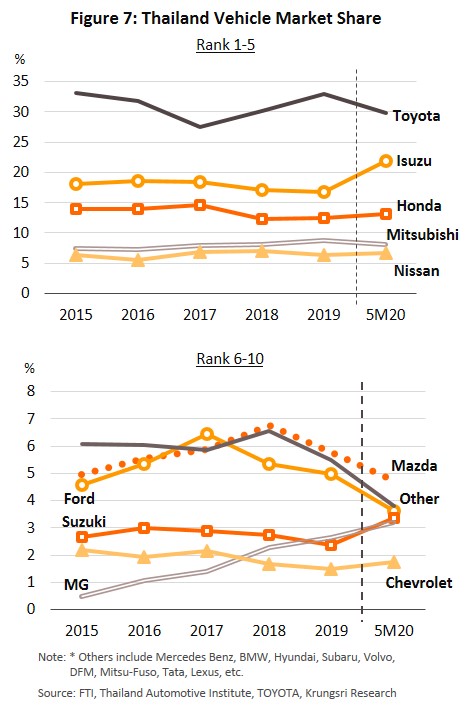 ปี 2560 ยอดขายรถยนต์ในประเทศกลับมาเติบโตเป็นครั้งแรกในรอบ 5 ปี และเพิ่มขึ้นสู่ระดับ 1 ล้านคันในปี 2561 เป็นครั้งแรกนับจากสิ้นสุดโครงการรถคันแรก (มีการทยอยส่งมอบรถยนต์ภายใต้โครงการฯ จนถึงปี 2556) ผลจาก (1) เศรษฐกิจไทยปี 2561 ขยายตัว 4.1% สูงสุดในรอบ 6 ปี (2) ผู้บริโภคบางส่วนต้องการเปลี่ยนรถยนต์ที่ซื้อในโครงการรถคันแรก หลังอายุการใช้งานครบ 5 ปีตามเงื่อนไขของทางการที่อนุญาตให้ซื้อ-ขายได้ และ (3) การแข่งขันด้านการตลาดที่รุนแรงกระตุ้นความต้องการซื้อรถยนต์เพิ่มขึ้นต่อเนื่อง โดยตัวแทนจำหน่ายรถยนต์เร่งผลักดันยอดขายผ่านกลยุทธ์สินเชื่อเงินทอน[3] ส่วนค่ายรถยนต์ เช่น Toyota และ MG พัฒนารถยนต์รุ่นใหม่และรถยนต์ไฟฟ้าออกสู่ตลาด ทำให้ได้รับความนิยมเพิ่มขึ้น ทั้งยังทำให้ส่วนแบ่งตลาดของค่ายรถทั้งสองเพิ่มขึ้นอย่างเห็นได้ชัด (ภาพที่ 7)