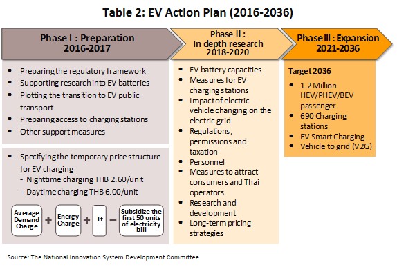 - มาตรการส่งเสริมการผลิตรถยนต์ไฟฟ้า (Electric Vehicle: EV) 3 ประเภท ได้แก่ รถยนต์ไฮบริด (Hybrid Electric Vehicle: HEV) รถยนต์ปลั๊กอินไฮบริด (Plug-in Hybrid Electric Vehicle: PHEV) และรถยนต์ไฟฟ้าแบตเตอรี่ (Battery Electric Vehicle: BEV) เป็น Product Champion ลำดับที่สามของไทย (ปี 2559-2579) ดังนี้ (1) รัฐบาลปรับเงื่อนไขให้ค่ายรถยนต์ที่ขอรับส่งเสริมการลงทุนในโครงการ Eco-car Phase l และ Phase ll สามารถนำปริมาณการผลิตรถยนต์ไฟฟ้ามานับรวมกับ Eco-car เพื่อรับสิทธิประโยชน์ในโครงการฯ ได้ (ที่ผ่านมาทั้งสองโครงการมีปริมาณการผลิตต่ำกว่าเงื่อนไขที่ BOI กำหนด) (2) มาตรการเร่งให้เกิดการผลิตรถยนต์ไฟฟ้า (พฤษภาคม 2562) โดยกำหนดให้ผู้ขอรับส่งเสริมการลงทุนผลิตรถ BEV สามารถขอรับส่งเสริมการลงทุนผลิตรถ HEV ร่วมด้วยได้ (ยื่นภายใน 31 ธันวาคม 2562) ภายใต้เงื่อนไขต้องผลิตรถ HEV ภายใน 3 ปีนับแต่วันออกบัตรส่งเสริม และต้องผลิตรถ BEV ภายในปีที่ 3 นับจากวันผลิตรถ HEV และ (3) มาตรการสนับสนุนตลาดรถยนต์ไฟฟ้าในประเทศ อาทิ สนับสนุนให้หน่วยงานรัฐและเอกชนขยายสถานีชาร์จไฟฟ้าเพื่ออำนวยความสะดวกในการใช้งานรถ EV และกำหนดอัตราภาษีสรรพสามิตรถยนต์ไฟฟ้าในระดับต่ำ (ตามเงื่อนไขการจัดเก็บภาษีตามอัตราการปล่อยก๊าซ CO2) ดังมีกรอบแนวทางดำเนินงานตามตารางที่ 2