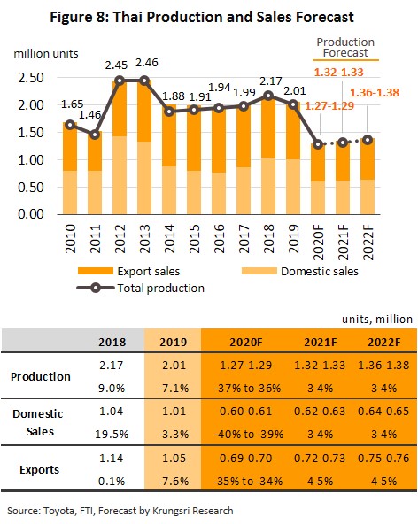 คาดว่าปริมาณการผลิตรถยนต์ปี 2563 จะหดตัว 36.0-37.0% อยู่ที่ 1.27-1.29 ล้านคัน อย่างไรก็ตาม คาดว่าปริมาณการผลิตจะกระเตื้องขึ้นในปี 2564-2565 มาเติบโตเฉลี่ย 3.0-4.0% ต่อปี เป็น 1.32-1.33 ล้านคันและ 1.36-1.38 ล้านคัน ตามลำดับ ตามเศรษฐกิจที่ทยอยฟื้นตัวจากการแพร่ระบาดของไวรัสคลี่คลาย