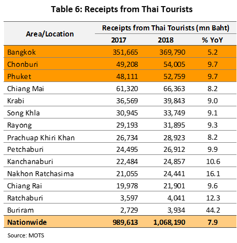 รายได้จากการท่องเที่ยวของนักท่องเที่ยวคนไทยอยู่ที่ 1.07 ล้านล้านบาท เติบโต 7.9% YoY (ตารางที่ 6) โดยพื้นที่ท่องเที่ยวสำคัญ 3 แห่ง ได้แก่ กรุงเทพฯ ชลบุรี และภูเก็ต สร้างรายได้รวมกันมากถึง 476,554 ล้านบาท คิดเป็นสัดส่วนถึง 44.6% ของรายได้รวมจากนักท่องเที่ยวไทยในปี 2561 สะท้อนถึงรายได้จากการท่องเที่ยวที่ยังคงกระจุกตัวอยู่ในพื้นที่ท่องเที่ยวหลัก ส่วนจังหวัดที่มีการเติบโตของรายได้สูงสุด คือ บุรีรัมย์ ขยายตัวถึง 44.2% YoY ซึ่งเป็นผลสำเร็จจากการส่งเสริมการท่องเที่ยวเชิงกีฬา (โดยเฉพาะการสร้างทีมฟุตบอลและสนามฟุตบอลที่มีชื่อเสียงโด่งดังทั่วประเทศ และการจัดการแข่งขันกีฬาระดับโลก อาทิ การแข่งขันจักรยานยนต์ทางเรียบชิงแชมป์โลก หรือ มอเตอร์ จีพี ไทยแลนด์)