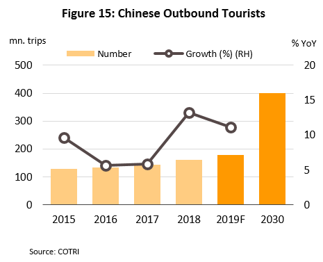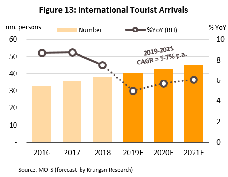 - นักท่องเที่ยวต่างชาติยังเป็นแรงขับเคลื่อนสำคัญของการท่องเที่ยวไทยทั้งด้านจำนวนและรายได้ โดยเฉพาะนักท่องเที่ยวจีน McKinsey คาดว่าปี 2568 กลุ่มชนชั้นกลางขึ้นไปของจีนจะครองสัดส่วนประมาณ 90% ของจำนวนประชากรในเมืองทั้งหมดของจีน (จาก 76% ในปี 2558) กลุ่มดังกล่าวมีแนวโน้มจะใช้จ่ายด้านการท่องเที่ยวสูง ทิศทางนี้จะหนุนให้การท่องเที่ยวนอกประเทศจีนเพิ่มขึ้น โดย China Outbound Tourism Research Institute (COTRI) คาดว่านักท่องเที่ยวจีนมีโอกาสเดินทางออกนอกประเทศราว 180 ล้านคนในปี 2562 และอาจมากกว่า 400 ล้านคน ในปี 2573 ขณะเดียวกันรัฐบาลไทยมีการโปรโมทให้นักท่องเที่ยวจีนมาไทยมากขึ้น (อาทิ กระทรวงการท่องเที่ยวและกีฬาออกมาตรการ VOA และมีโร้ดโชว์ไปยังเมืองอื่นๆ ของจีน โดยตั้งเป้าหมายจำนวนนักท่องเที่ยวจีนมาไทย 11-12 ล้านคน ในปี 2562)