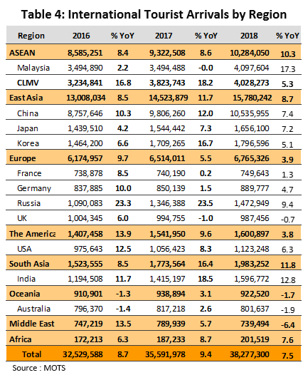 มาเลเซีย: นับเป็นตลาดหลักในเอเชียที่จำนวนนักท่องเที่ยวมีอัตราการเติบโตสูงในช่วงหลายๆ ปีที่ผ่านมา และเป็นตลาดเพื่อนบ้านที่สร้างรายได้จากการท่องเที่ยวให้แก่ประเทศไทยเป็นจำนวนมากเมื่อเทียบกับประเทศ CLMV (ปี 2560 นักท่องเที่ยวมาเลเซียสร้างรายได้มูลค่า 9.5 หมื่นล้านบาท ขณะที่รายได้จากประเทศ CLMV รวมกันมีมูลค่า 1.3 แสนล้านบาท) ปัจจัยสำคัญที่ทำให้นักท่องเที่ยวมาเลเซียเติบโตต่อเนื่องเป็นผลจากการเติบโตของการค้าชายแดนระหว่างไทย-มาเลเซีย โดยนักท่องเที่ยวมาเลเซียเดินทางเข้าประเทศไทยผ่านด่าน อ. สะเดา (ด่านหลัก) ด่าน อ.เบตง และด่าน อ.สุไหงโกลก นอกจากนี้การเปิดเส้นทางบินมาเลเซีย-เชียงใหม่ทำให้นักท่องเที่ยวมาเลเซียเดินทางไปเชียงใหม่เพิ่มขึ้น (ปี 2560 จำนวนนักท่องเที่ยวมาเลเซียที่เข้าพักโรงแรมในเชียงใหม่เพิ่มขึ้น 19.4% YoY)
