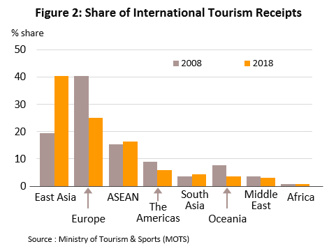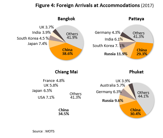 เมื่อพิจารณาด้านอุปสงค์ของธุรกิจโรงแรมจากรายได้ของนักท่องเที่ยวพบว่า นักท่องเที่ยวต่างชาติก่อให้เกิดรายได้คิดเป็นสัดส่วนสูงถึง 65% ของรายได้จากการท่องเที่ยวรวม เนื่องจากนักท่องเที่ยวต่างชาติมีค่าใช้จ่ายต่อหัวสูงและจำนวนวันพักยาวกว่าคนไทย โดยเฉพาะนักท่องเที่ยวจากเอเชียตะวันออก (จีน ญี่ปุ่น เกาหลีใต้ ฮ่องกง และไต้หวัน) ถือเป็นตลาดหลักทั้งด้านรายได้ (สัดส่วน 40% ของรายได้จากนักท่องเที่ยวต่างชาติทั้งหมด) (ภาพที่ 2) และจำนวน (สัดส่วน 41% ของจำนวนนักท่องเที่ยวต่างชาติทั้งหมด) (ภาพที่ 3) รองลงมาด้านรายได้ คือ ตลาดยุโรป คิดเป็น 25% ส่วนด้านจำนวนนักท่องเที่ยว รองลงมา คือ ตลาดอาเซียนคิดเป็น 27%