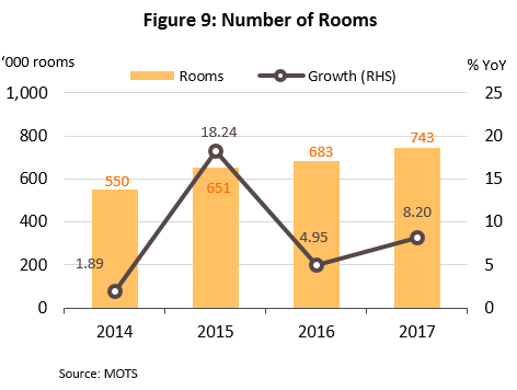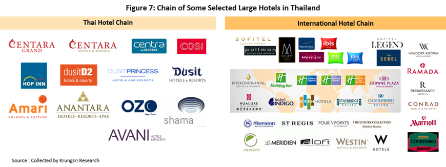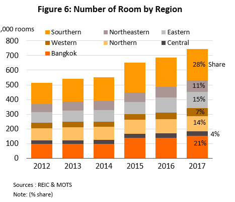 เมื่อพิจารณาด้านอุปทาน ปัจจุบันธุรกิจโรงแรมขยายตัวเพิ่มขึ้นทั้งด้านจำนวนโรงแรมและจำนวนห้องพักตามการเติบโตของภาคท่องเที่ยว ทั้งนี้ ในอดีตนักท่องเที่ยวต่างชาติมักกระจุกตัวอยู่ในกรุงเทพฯ ซึ่งเป็นศูนย์กลางการท่องเที่ยวและการเดินทางของประเทศ รวมถึงภูเก็ต และพัทยา (จ.ชลบุรี) ซึ่งเป็นแหล่งท่องเที่ยวทางทะเลที่มีชื่อเสียงหรือเป็นจุดหมายปลายทางที่สำคัญ (Tourist Destination) ทั้งนี้ ในช่วง 5 ปีที่ผ่านมา ภาครัฐกระตุ้นให้เกิดการท่องเที่ยวในประเทศผ่านนโยบายและโครงการต่างๆ มากขึ้น ประกอบกับการพัฒนาเส้นทางคมนาคมและสนามบินในภูมิภาคหลายพื้นที่เหนี่ยวนำให้เกิดการลงทุนขยายธุรกิจโรงแรมเพิ่มขึ้นตามมาในจังหวัดศูนย์กลางภูมิภาคและเมืองท่องเที่ยวต่างๆ อาทิ พัทยา ภูเก็ต เชียงใหม่ กระบี่ เกาะสมุย (จ.สุราษฎร์ธานี) ส่งผลให้จำนวนห้องพักทั่วประเทศเพิ่มขึ้นจากจำนวน 515,087 ห้อง ในปี 2555 เป็น 743,107 ห้องในปี 2560 (ภาพที่ 6) หรือเติบโตเฉลี่ย 7.6% ต่อปี โดยมีทั้งเชนโรงแรมไทยและโรงแรมต่างชาติ (International Hotel Chain) (ภาพที่ 7)