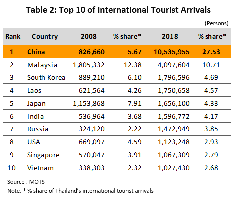 จีน: เป็นตลาดใหญ่อันดับ 1 ของไทย มีนักท่องเที่ยวประมาณ 10.5 ล้านคน คิดเป็นสัดส่วน 27.5% ของจำนวนนักท่องเที่ยวต่างชาติทั้งหมดของไทย (ข้อมูลปี 2561, ตารางที่ 2)