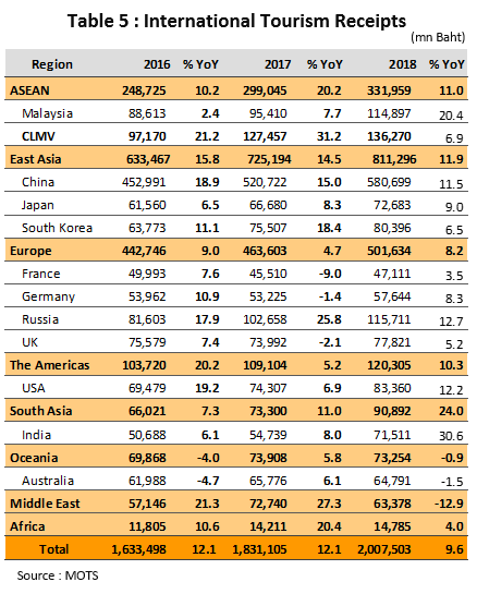 - นักท่องเที่ยวต่างชาติมีจำนวน 38.3 ล้านคน ขยายตัว 7.5% YoY โดยเติบโตเกือบทุกตลาด นักท่องเที่ยวเอเชียตะวันออก (จีน ญี่ปุ่น เกาหลีใต้ ฮ่องกง และไต้หวัน) ซึ่งเป็นตลาดหลักขยายตัว 8.7% YoY (ตารางที่ 4) นำโดยนักท่องเที่ยวจีน ขยายตัว 7.4% YoY โดยครึ่งปีแรกเติบโตถึง 25.9% ขณะที่ครึ่งปีหลังหดตัว 9.6% YoY จากอุบัติเหตุเรือล่มที่ภูเก็ตเมื่อเดือนกรกฎาคม นักท่องเที่ยวจากตลาดยุโรปเพิ่มขึ้น 3.9%YoY จากการฟื้นตัวต่อเนื่องของนักท่องเที่ยวรัสเซีย (+9.4% YoY) (ตารางที่ 4) ที่ได้อานิสงส์จากเศรษฐกิจรัสเซียกระเตื้องขึ้นและการเพิ่มเที่ยวบินตรงไทย-รัสเซีย อย่างไรก็ตาม ตลาดยุโรปและรัสเซียเติบโตชะลอลง ส่วนหนึ่งเป็นผลจากการกลับไปยังแหล่งท่องเที่ยวสำคัญของชาวยุโรป อาทิ อียิปต์ และตุรกี ส่วนนักท่องเที่ยวเอเชียใต้ขยายตัวมากที่สุด (+11.8% YoY) อานิสงส์จากการเติบโตต่อเนื่องของนักท่องเที่ยวอินเดีย ขณะที่นักท่องเที่ยวจากตะวันออกกลางหดตัว (-6.4% YoY) เนื่องจากกำลังซื้อโดยรวมได้รับผลกระทบจากการปรับขึ้นภาษีมูลค่าเพิ่ม 5% (มีผลบังคับตั้งแต่ 1 มกราคม 2561) ในประเทศซาอุดิอาระเบียและสหรัฐอาหรับเอมิเรตส์