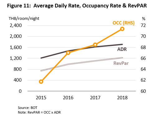 ปี 2561 ธุรกิจโรงแรมยังคงเติบโตต่อเนื่องตามจำนวนนักท่องเที่ยวต่างชาติและไทย หนุนให้อัตราเข้าพักเฉลี่ยของโรงแรมปรับเพิ่มขึ้น โดยการขยายตัวของนักท่องเที่ยวต่างชาติมีปัจจัยสนับสนุนจาก 1) การฟื้นตัวอย่างต่อเนื่องของเศรษฐกิจโลก 2) การเพิ่มขึ้นของเที่ยวบินตรงและเที่ยวบินเช่าเหมาลำ การเติบโตของสายการบินต้นทุนต่ำ โดยเฉพาะจากจีน อาทิ Xiamen Airlines, China Eastern Airlines, Juneyao Airlines และ Spring Airlines เป็นต้น และ 3) มาตรการส่งเสริมการท่องเที่ยว อาทิ ยกเว้นค่าธรรมเนียม VOA (Visa on Arrivals) สำหรับนักท่องเที่ยวจาก 21 ประเทศ[3] ส่วนนักท่องเที่ยวไทยขยายตัวตามเศรษฐกิจที่เติบโตดีและมาตรการกระตุ้นการท่องเที่ยวจากภาครัฐ