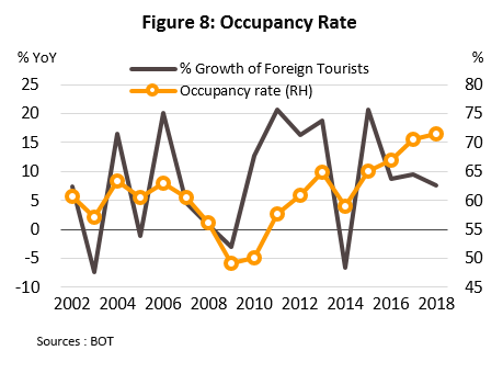 ธุรกิจโรงแรมของไทยในภาพรวมปรับตัวดีขึ้น แต่ในบางพื้นที่เผชิญปัญหาอุปทานส่วนเกิน (Excess supply) ช่วงปี 2544 -2550 นักท่องเที่ยวไทยและต่างชาติเติบโตดีในอัตรา 6.2% และ 7.4% ต่อปี ตามลำดับ ขณะที่อัตราการเข้าพัก (Occupancy Rate) อยู่ในระดับเฉลี่ยต่ำเพียง 60.7% (ภาพที่ 8) ผลจากการขยายการลงทุนของธุรกิจโรงแรมและที่พักจำนวนมาก หลังจากนั้นในช่วงปี 2551-2557 จำนวนนักท่องเที่ยวไทยและต่างชาติเพิ่มขึ้นในอัตรา 7.5% และ 8.5 % ต่อปี ตามลำดับ แต่อัตราเข้าพักเฉลี่ยลดลงอย่างมีนัยสำคัญมาอยู่ที่ 56.8% ต่อปี เนื่องจากห้องพักที่เพิ่มขึ้นต่อเนื่องทั้งจากธุรกิจเดียวกัน (จำนวนห้องพักของโรงแรมเพิ่มขึ้นเฉลี่ย 8% ต่อปีในช่วงปี 2551-2557) และธุรกิจที่คล้ายคลึงกัน (อพาร์ตเมนต์และคอนโดมิเนียมที่เปิดบริการให้เช่าเป็นรายวัน) ทำให้การแข่งขันรุนแรงขึ้น