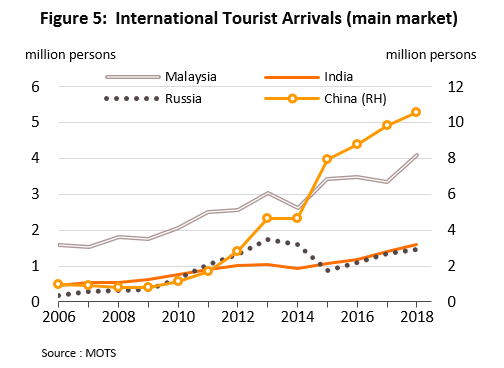 นักท่องเที่ยวต่างชาติที่เป็นตลาดหลักของไทยที่สำคัญ คือ จีน มาเลเซีย อินเดีย และรัสเซีย