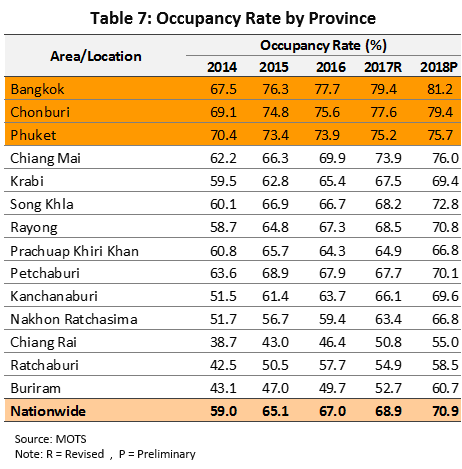 - อัตราการเข้าพัก (Occupancy Rate) เฉลี่ยทั่วประเทศปี 2561 เพิ่มขึ้นเป็น 71.4% จาก 70.6% ในปี 2560 (ภาพที่ 8) ทั้งนี้ หากพิจารณาจำแนกรายจังหวัด (ข้อมูลจากกระทรวงการท่องเที่ยวและกีฬา) พบว่าอัตราเข้าพักเฉลี่ยปรับเพิ่มขึ้นทุกพื้นที่ (ตารางที่ 7) พื้นที่ท่องเที่ยวหลัก นำโดยกรุงเทพฯ อยู่ที่ 81.2% (เทียบกับ 79.4% ในปี 2560) ชลบุรี 79.4% (เทียบกับ 77.6%) ยกเว้นภูเก็ตปรับขึ้นเล็กน้อยมาอยู่ที่ 75.7% (เทียบกับ 75.2%) ผลกระทบจากเหตุการณ์เรือล่มเมื่อช่วงกลางปี ส่งผลให้นักท่องเที่ยวจีนหดตัวต่อเนื่องในช่วงครึ่งปีหลัง จังหวัดศูนย์กลางภูมิภาคและเมืองรองปรับตัวเพิ่มขึ้นเช่นกัน สะท้อนถึงมาตรการส่งเสริมการท่องเที่ยวเมืองรองของภาครัฐมีประสิทธิผล