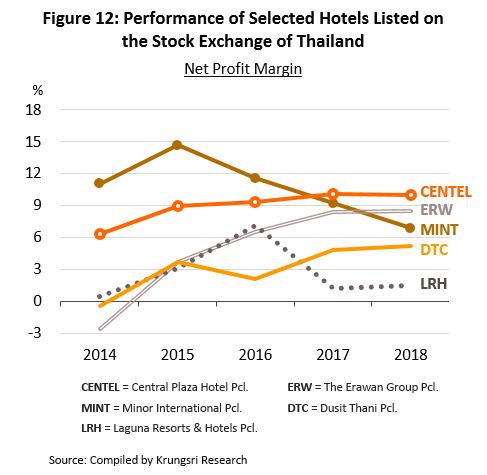 ผลการดำเนินงานของผู้ประกอบการโรงแรมรายใหญ่ (พิจารณาเฉพาะบริษัทที่จดทะเบียนในตลาดหลักทรัพย์) ส่วนใหญ่ยังเติบโตต่อเนื่องในปี 2561 (ภาพที่ 12) ตามการเพิ่มขึ้นของอัตราเข้าพัก โดยผู้ประกอบการรายใหญ่ยังคงขยายฐานรายได้ต่อเนื่องผ่านการลงทุนทั้งในและต่างประเทศรวมถึงการรับบริหารโรงแรมในต่างประเทศอีกด้วย