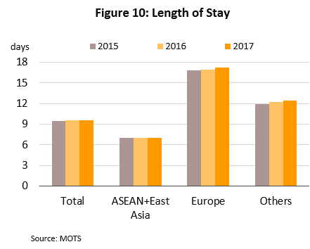 - จำนวนวันพักเฉลี่ยของนักท่องเที่ยวต่างชาติทรงตัวที่ 9.52 วัน (ข้อมูลล่าสุดปี 2560) จากเฉลี่ย 9.56 วันในปี 2559 (ภาพที่ 10) โดยนักท่องเที่ยวยุโรปเป็นกลุ่มที่มีการพำนักยาวนานที่สุดเมื่อเทียบกับนักท่องเที่ยวกลุ่มอื่นๆ ผลจากระยะทางไกลและส่วนใหญ่มาพำนักเพื่อหนีอากาศหนาว